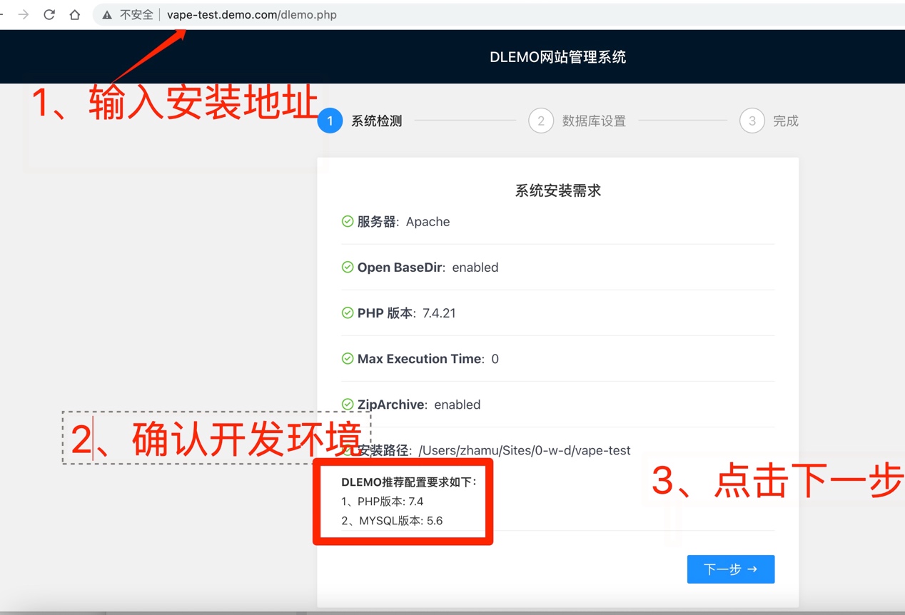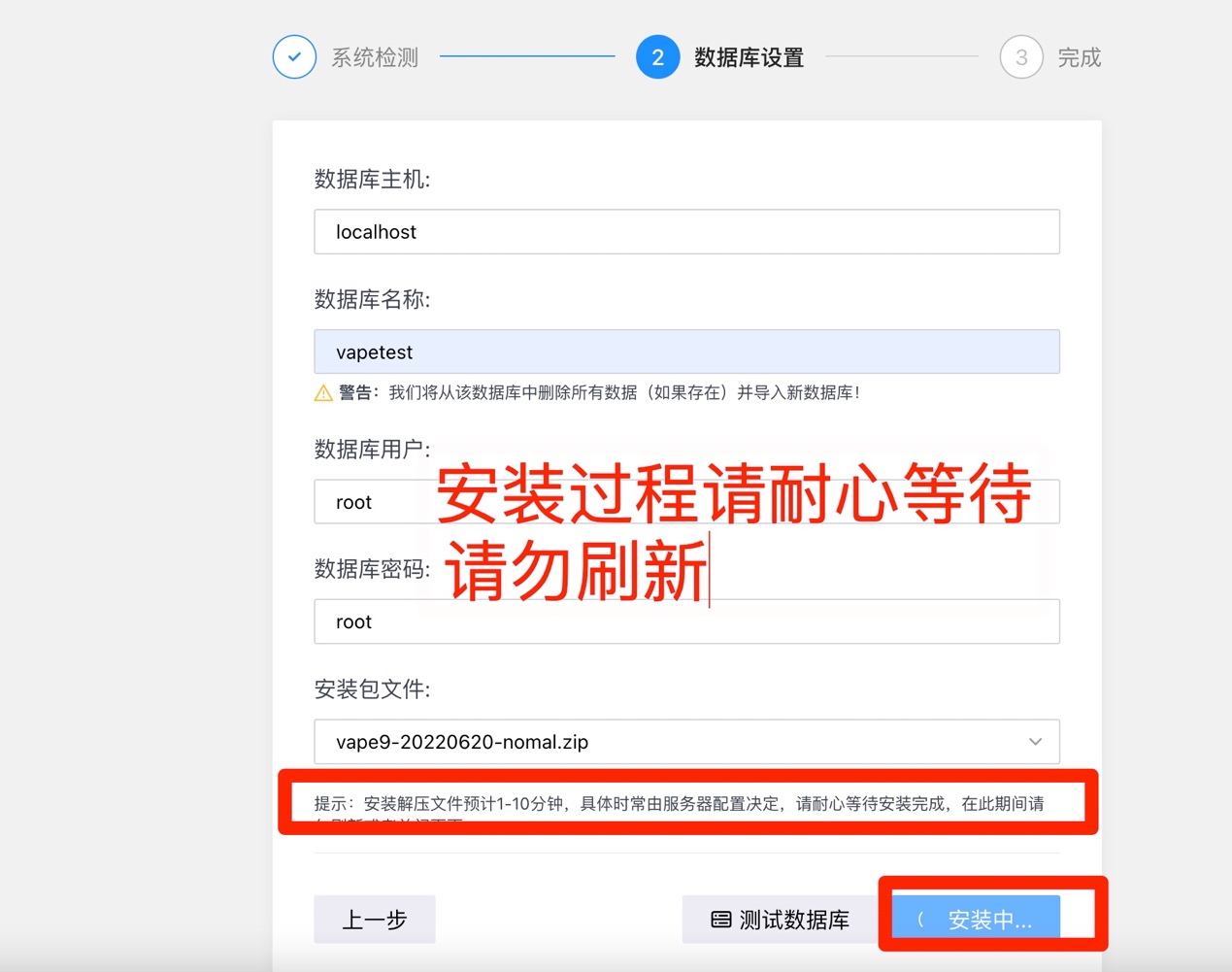 第三步:按照提示输入数据库名称、用户名、密码、并选择安装包;
