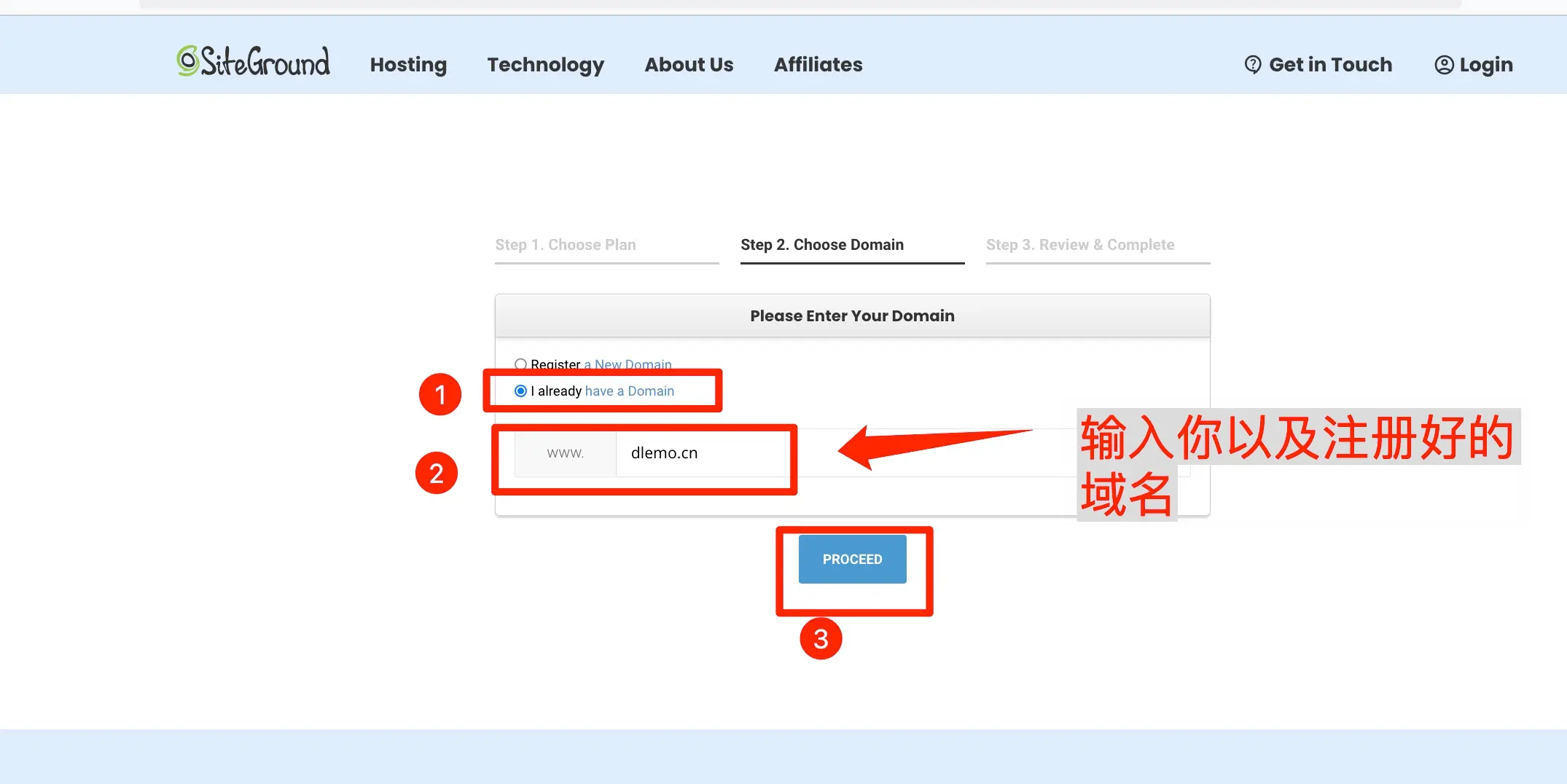3.3、以下为自备域名的注册方式,输入已经注册好的域名,点击Proceed